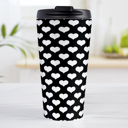 White Hearts Pattern Black Travel Mug