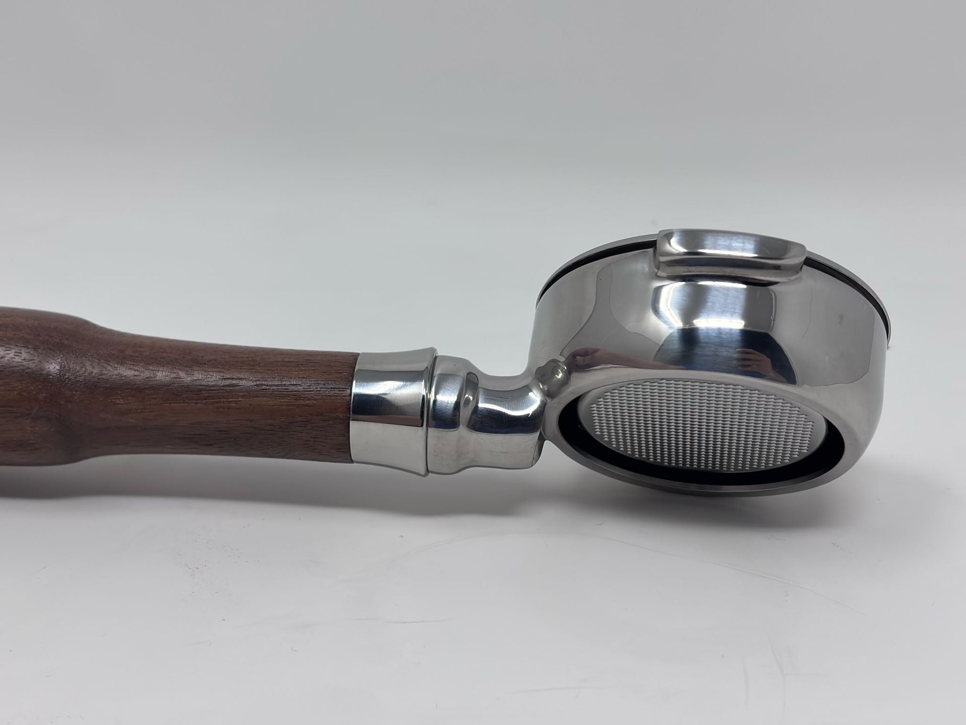58mm Bottomless Portafilter with Wood Handle. Fits Turin Legato and Turin Gallatin as well as some other popular 58mm espresso machines. Comes with double basket.