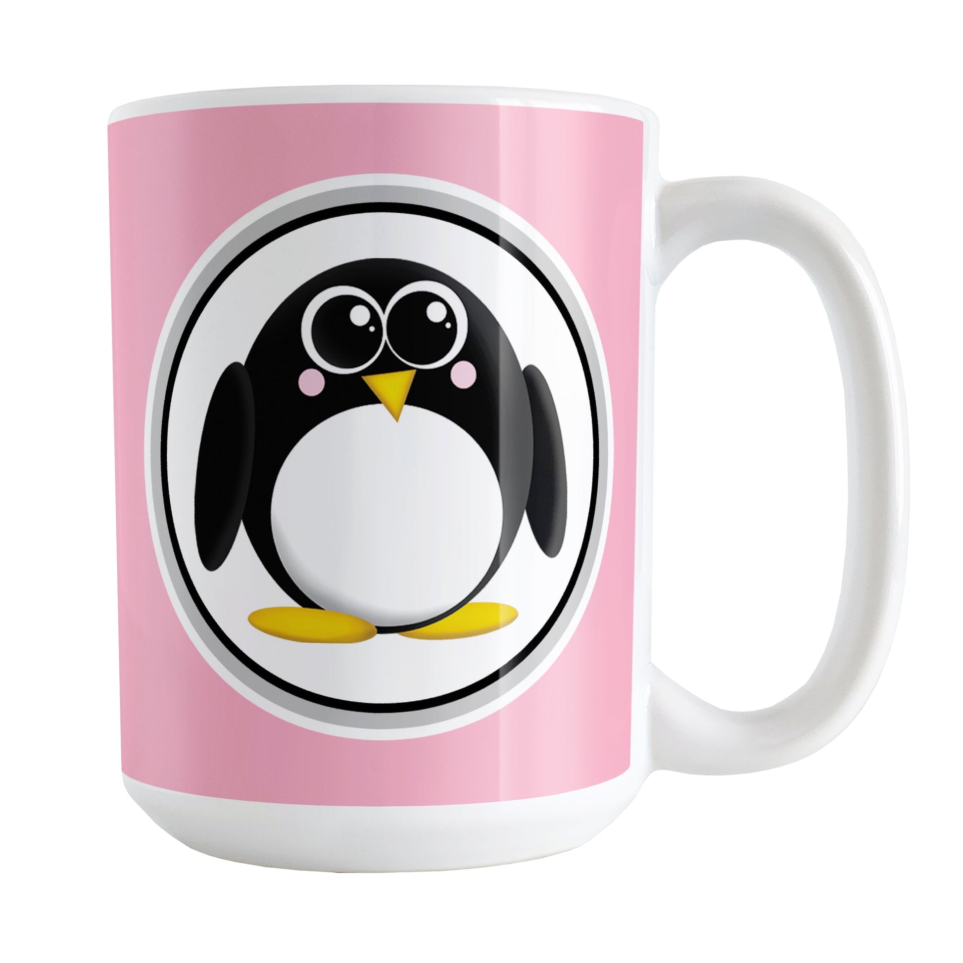 Introducing the Adorable Pink Penguin Mug! This delightful mug showcases a charming rounded penguin in a white circle on both sides, set against a pink background that wraps around the mug up to the handle. It's the perfect choice for those who adore penguins, love cute animal designs, and have a fondness for the color pink.