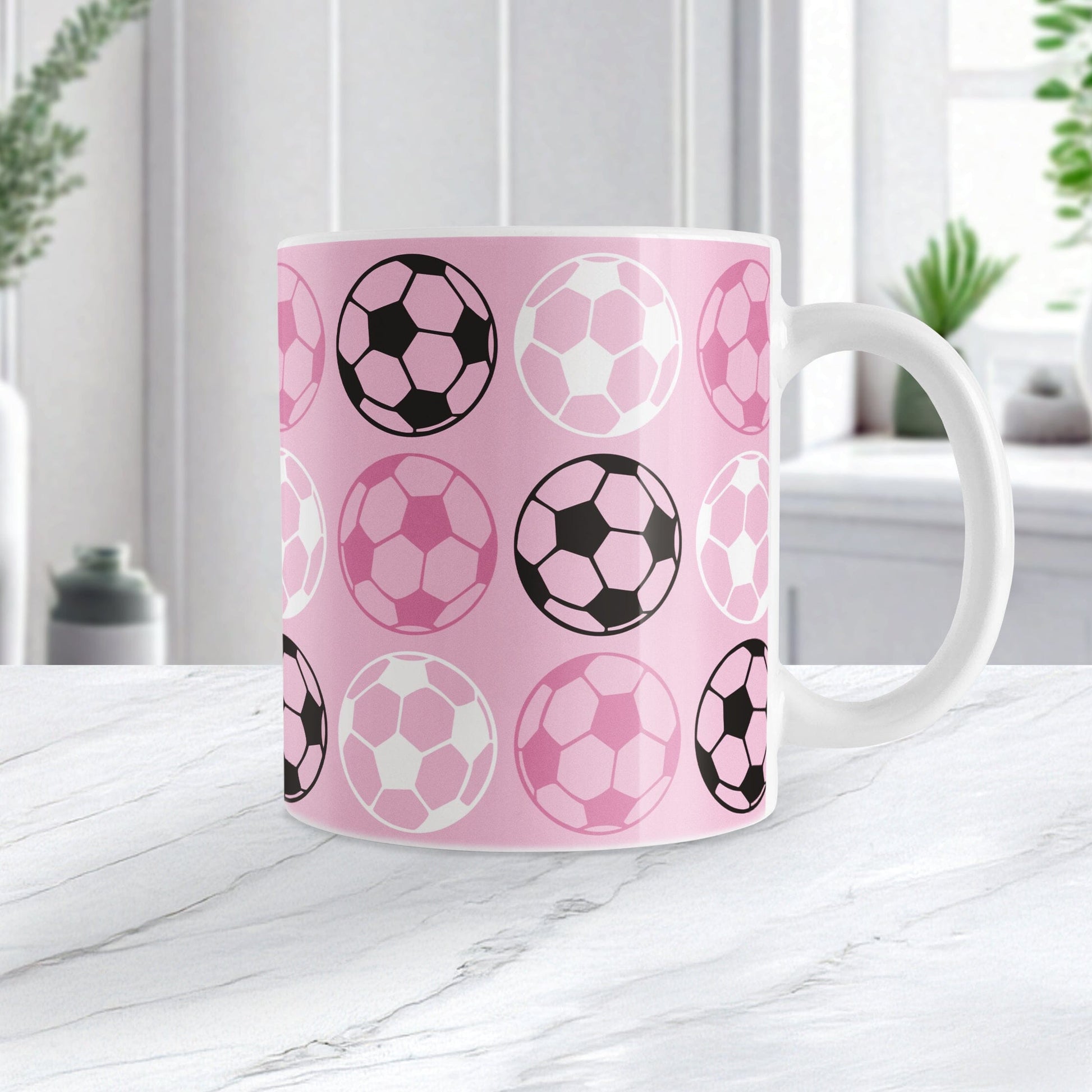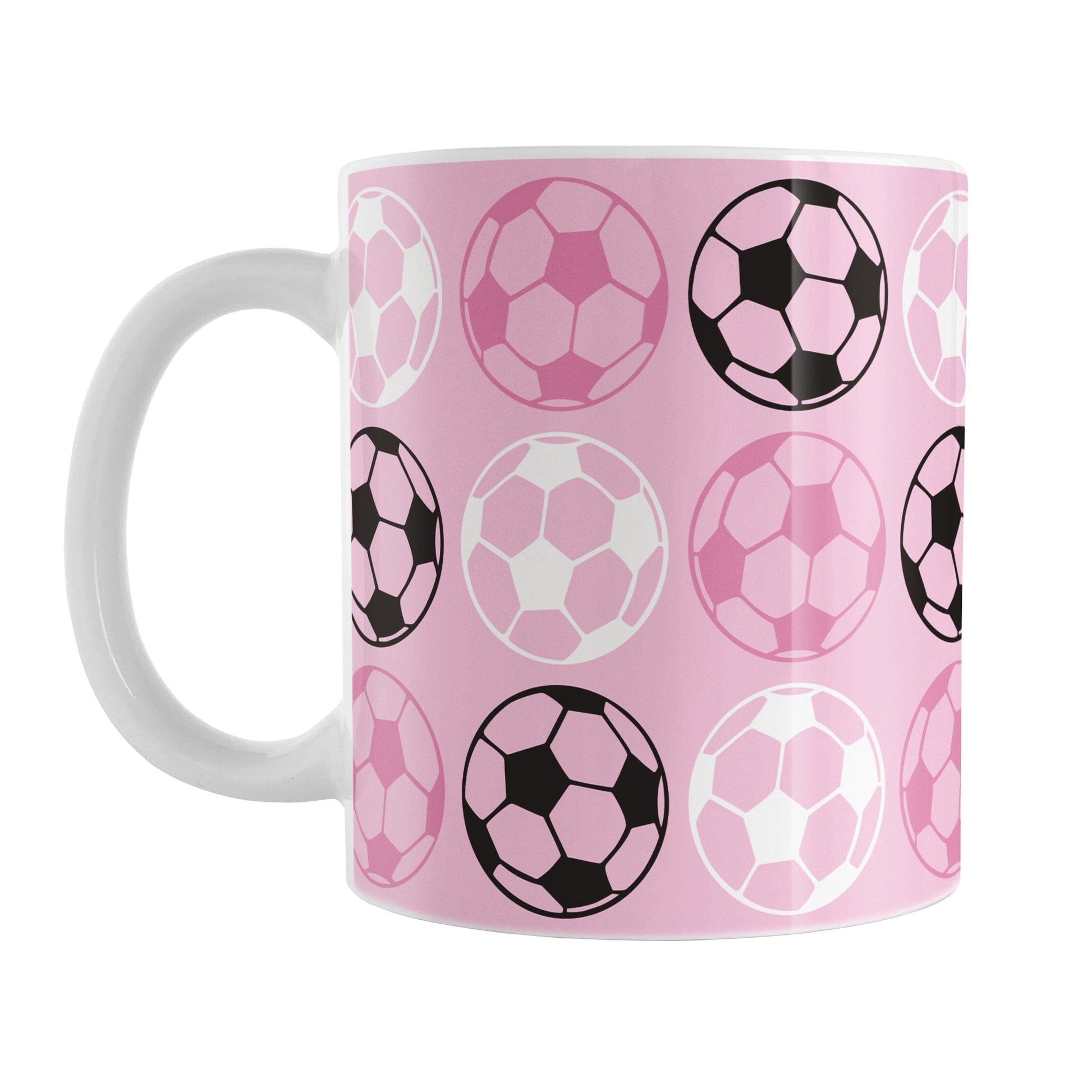 The Alternating Pink Soccer Balls Mug showcases a playful repeating pattern of soccer balls in soft pink tones, black, and white against a light pink background. The wraparound design extends up to the handle, giving the mug a balanced look from all sides.