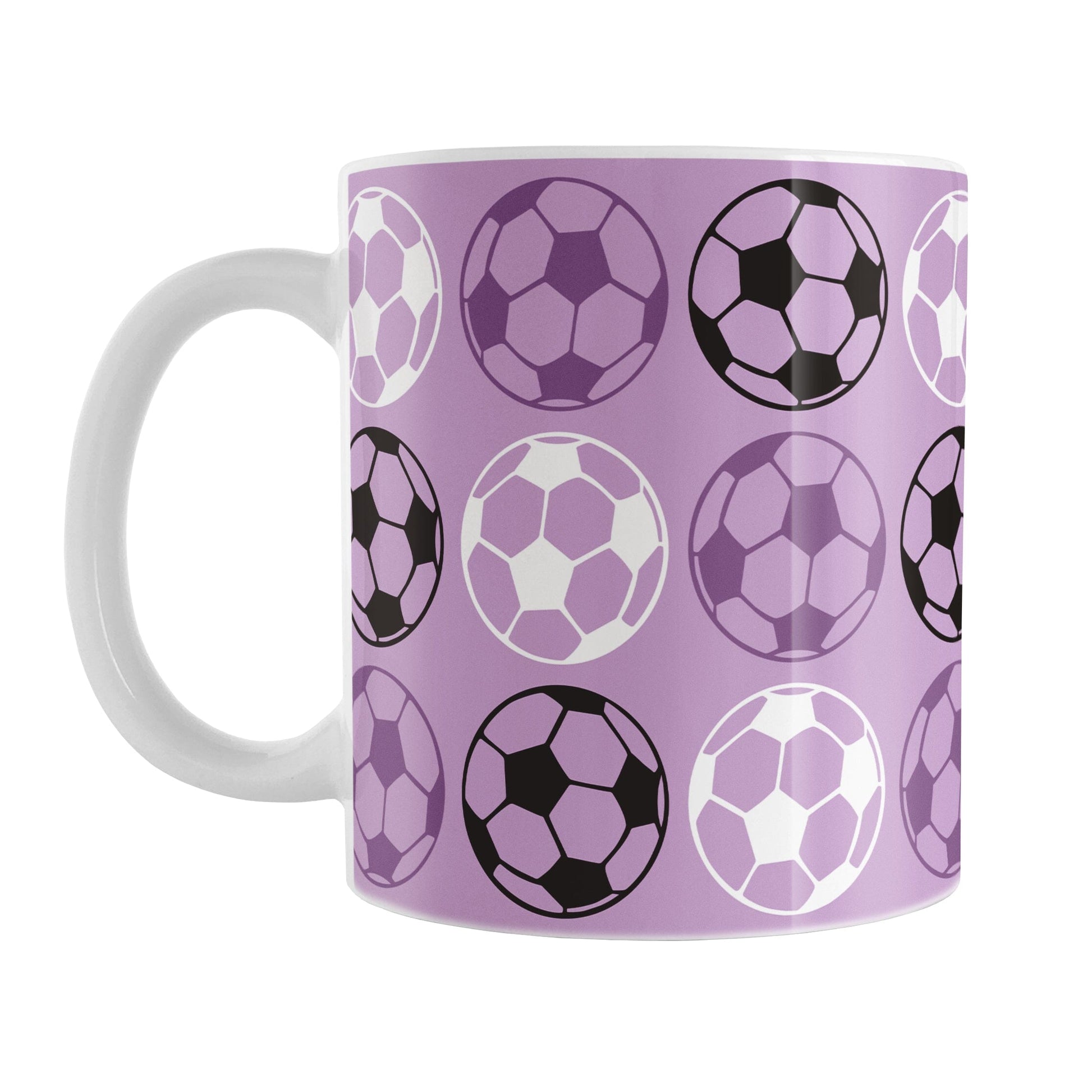 The Alternating Purple Soccer Balls Mug features a bold repeating pattern of dark purple, black, and white soccer balls arranged in an alternating layout over a purple background. The design wraps around the mug up to the handle, so it looks great from every angle.