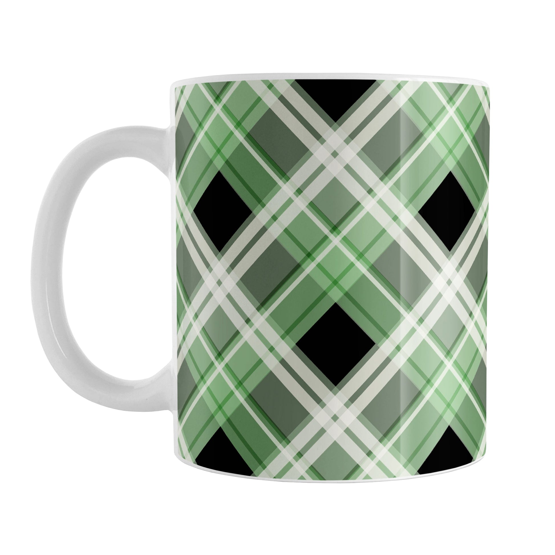 Discover the timeless appeal of our Alternative Green Plaid Mug, featuring a diagonal green, black, and white plaid pattern that wraps around the entire mug up to the handle. This mug is a perfect addition for men and women who enjoy classic designs and love incorporating plaid into their daily drinkware.