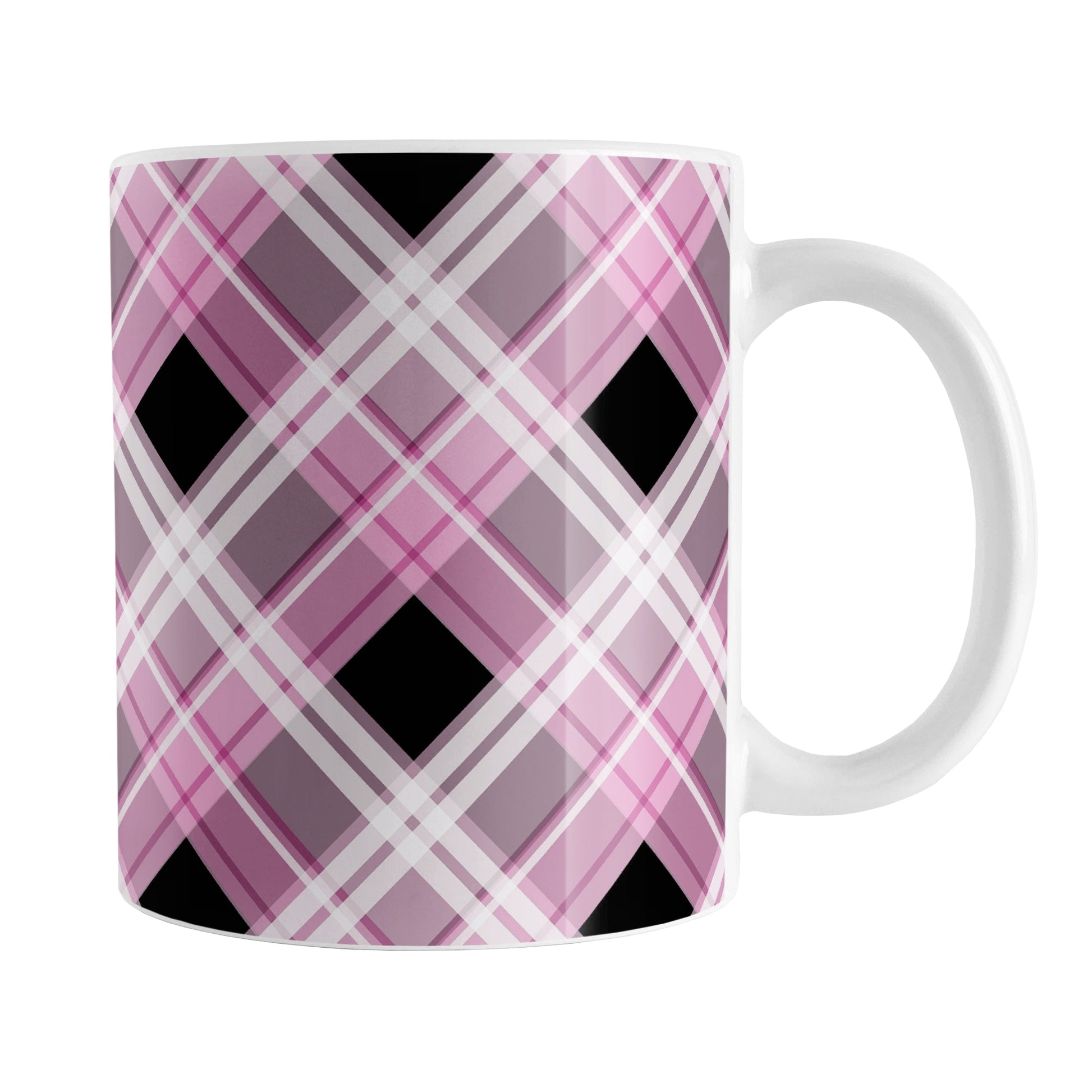 Add a touch of stylish flair to your drinkware collection with our Alternative Pink Plaid Mug. Designed with a diagonal pink, black, and white plaid pattern that wraps around the mug up to the handle, this eye-catching mug is perfect for those who love bold and unique designs.