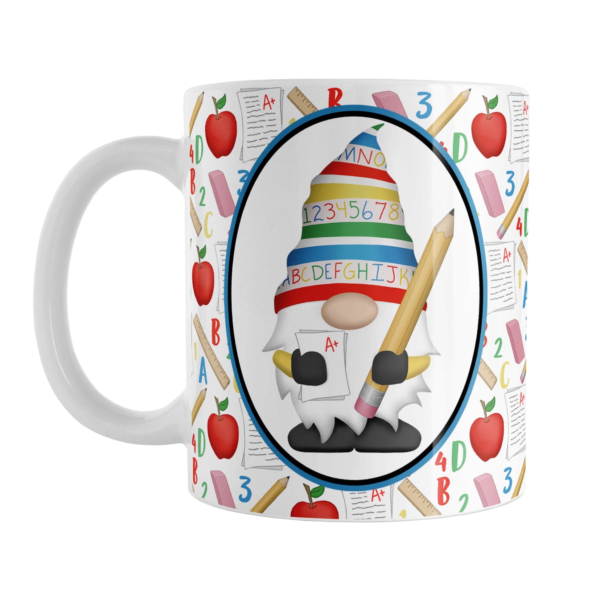 Brighten up your classroom or home with our adorable Teacher Gnome School Pattern Mug, crafted to celebrate the joy of teaching with a whimsical touch. This charming mug features an endearing gnome wearing a festive hat adorned with vibrant primary-colored numbers and letters. The gnome holds an oversized pencil and a graded A+ paper, framed inside an oval on both sides of the mug over a playful school-themed pattern that wraps around the mug up to the handle, showcasing illustrations of apples, rulers, erasers, graded papers, numbers, and letters. Perfect for educators and gnome enthusiasts alike, this mug adds a delightful touch to any setting.