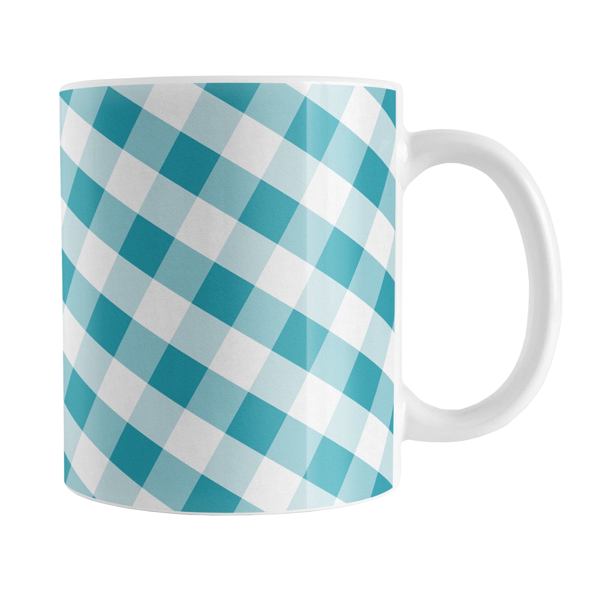 - Charming Design: Features a slanted white and turquoise gingham pattern that wraps around the mug up to the handle.