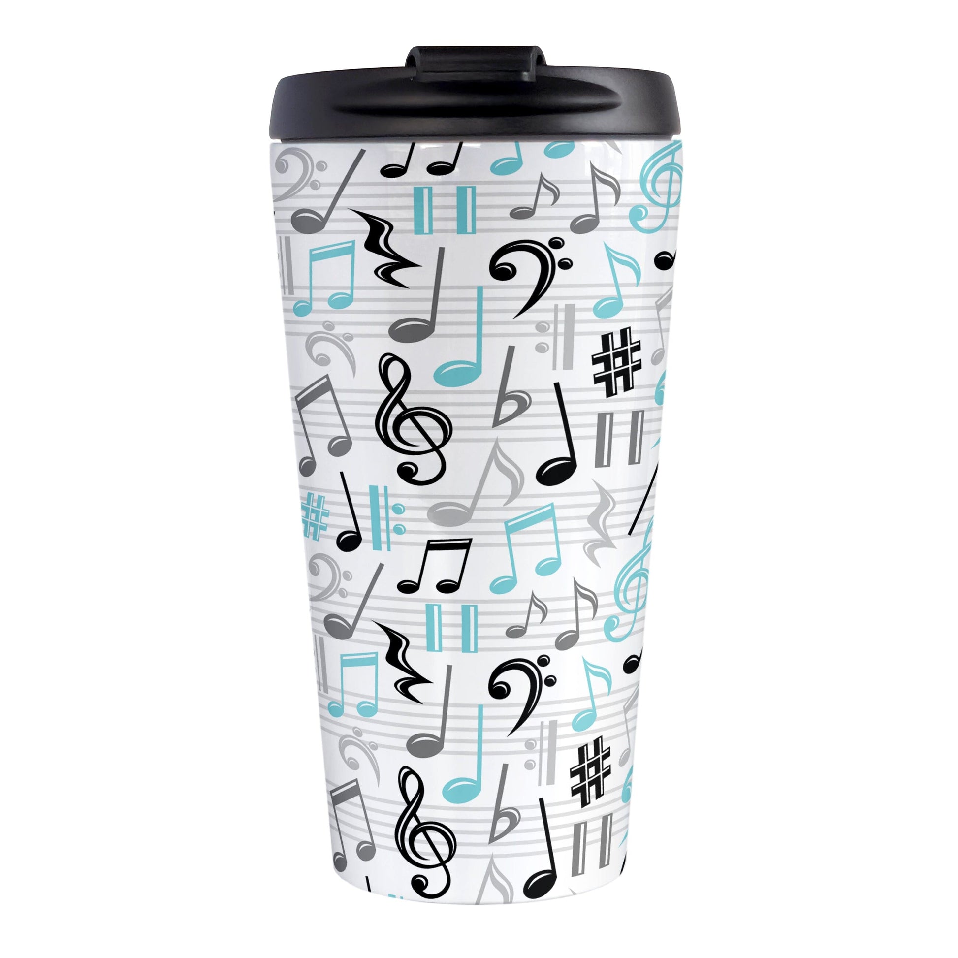 Embrace the perfect combination of style and practicality with our Turquoise Music Notes Pattern Travel Mug. Designed for music lovers, this travel mug features an energetic pattern of music notes and symbols in light turquoise, black, and gray. The dynamic design wraps around the mug, creating a visually captivating look that’s sure to inspire any music enthusiast.