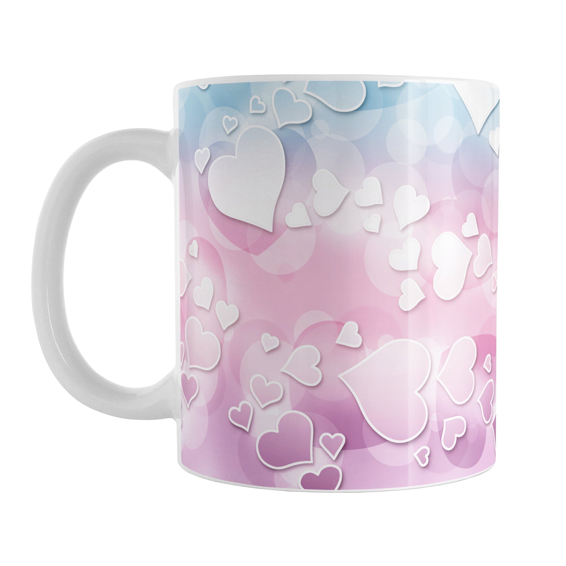If you adore hearts and whimsical designs, this mug is made for you. The playful heart pattern is set against a dreamy bokeh background, creating a sense of magic and wonder. The gradient effect blends pink, blue, and purple hues beautifully, making it a visually stunning piece that stands out. It's ideal for anyone who appreciates the charming combination of these colors and loves to surround themselves with cheerful, heartwarming designs.