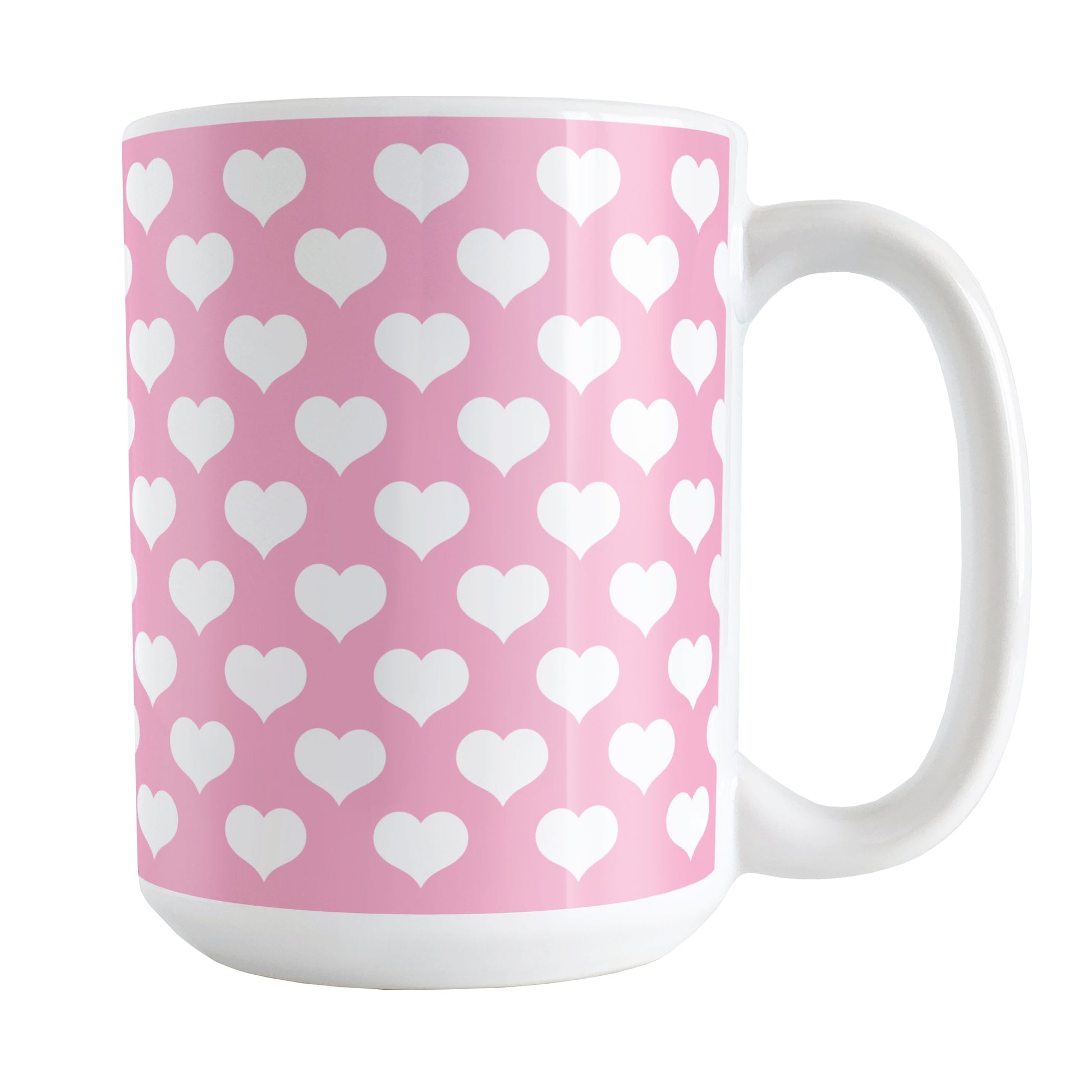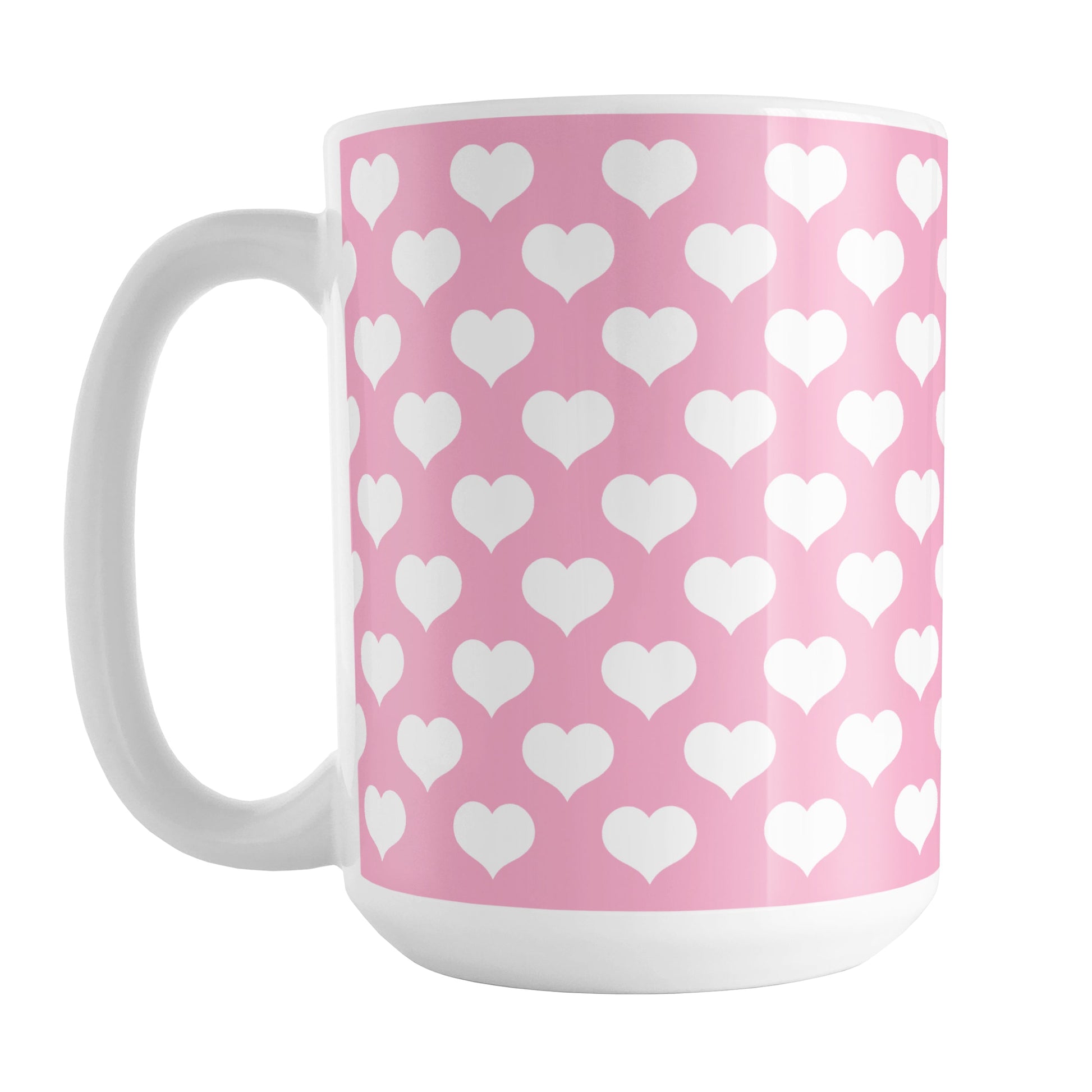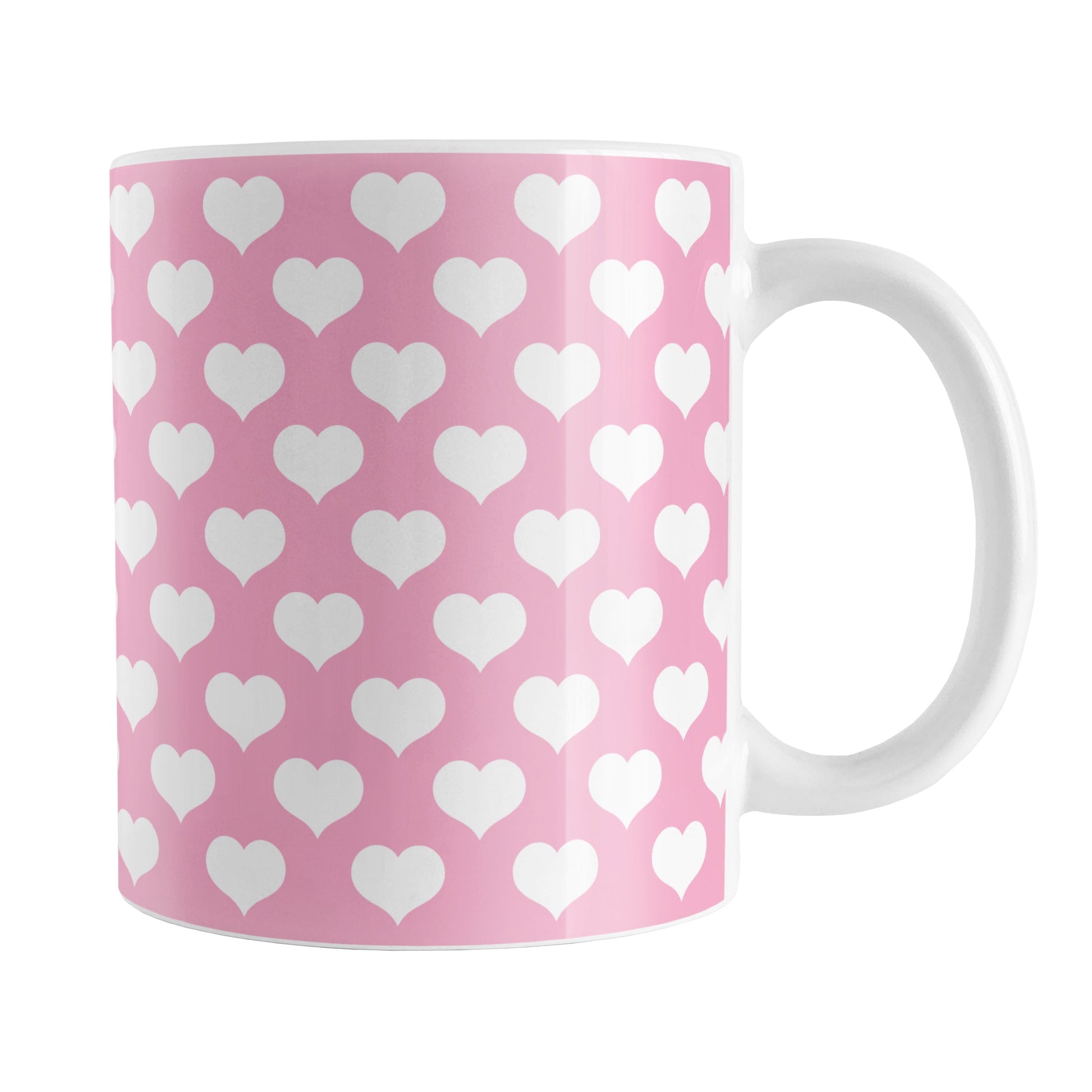 Introducing the White Hearts Pattern Pink Mug, an exquisite piece of drinkware that brings together charm, cuteness, and functionality. This delightful mug features a design of white hearts arranged in a polka-dotted style pattern against a pink background. The pattern wraps around the mug up to the handle, ensuring a visually pleasing and cohesive appearance from every angle. Ideal for those who adore heart motifs and the color pink, this mug is a must-have for adding a touch of romance to your daily routine.