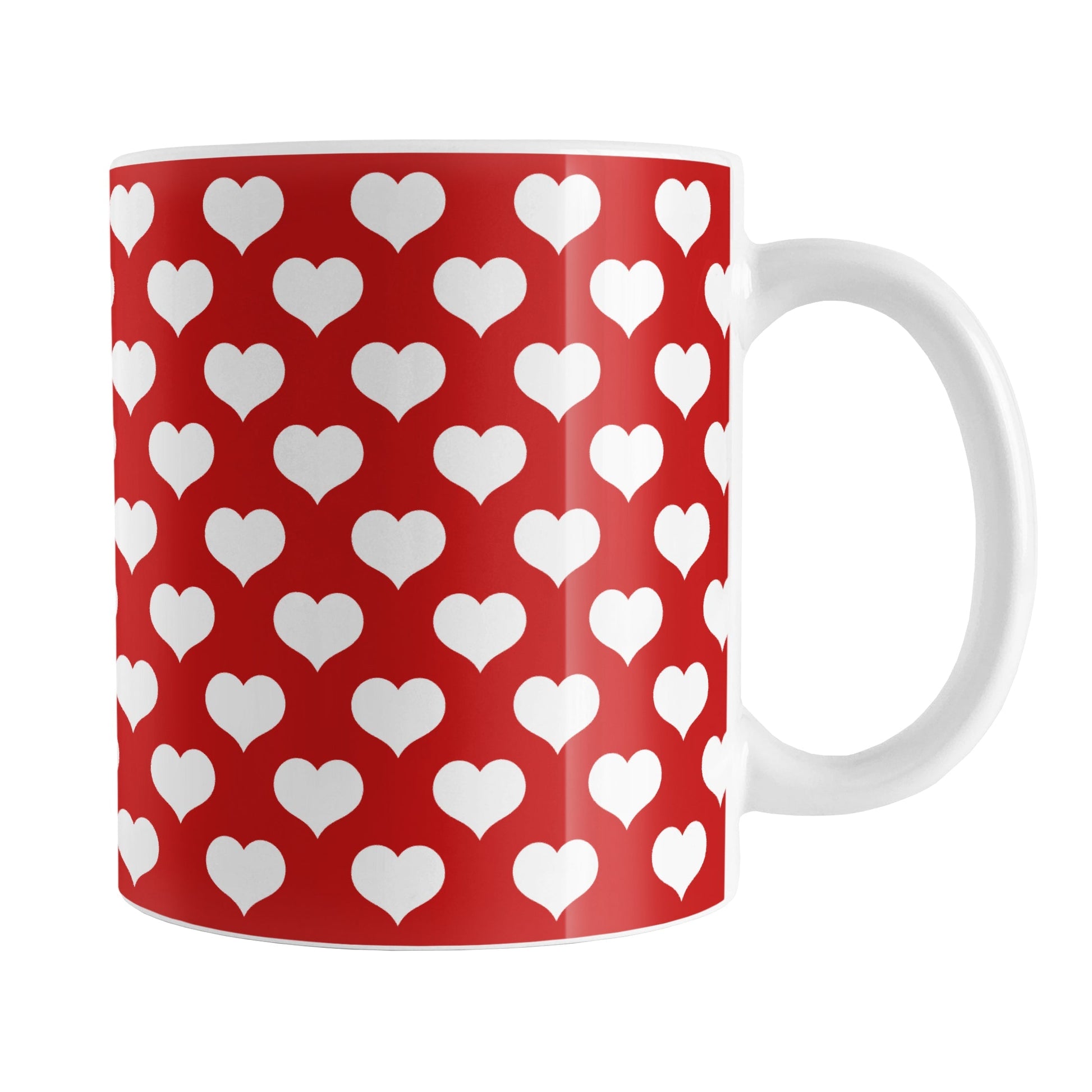 Introducing the White Hearts Pattern Red Mug, an enchanting piece of drinkware that perfectly blends style and practicality. This beautiful mug features an adorable design of white hearts arranged in a polka-dotted style pattern against a vibrant red background. The pattern wraps around the mug up to the handle, ensuring a visually appealing and cohesive look. Ideal for those who love heart designs and the color red, this mug is a charming addition to any collection.