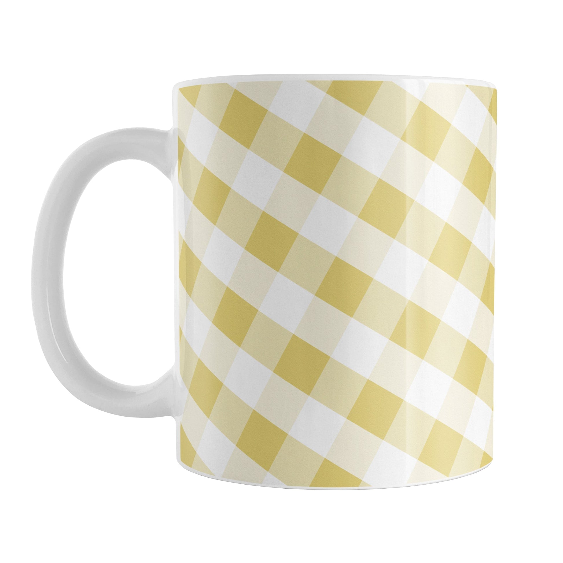 - Charming Design: Features a slanted white and yellow gingham pattern that wraps around the mug up to the handle.