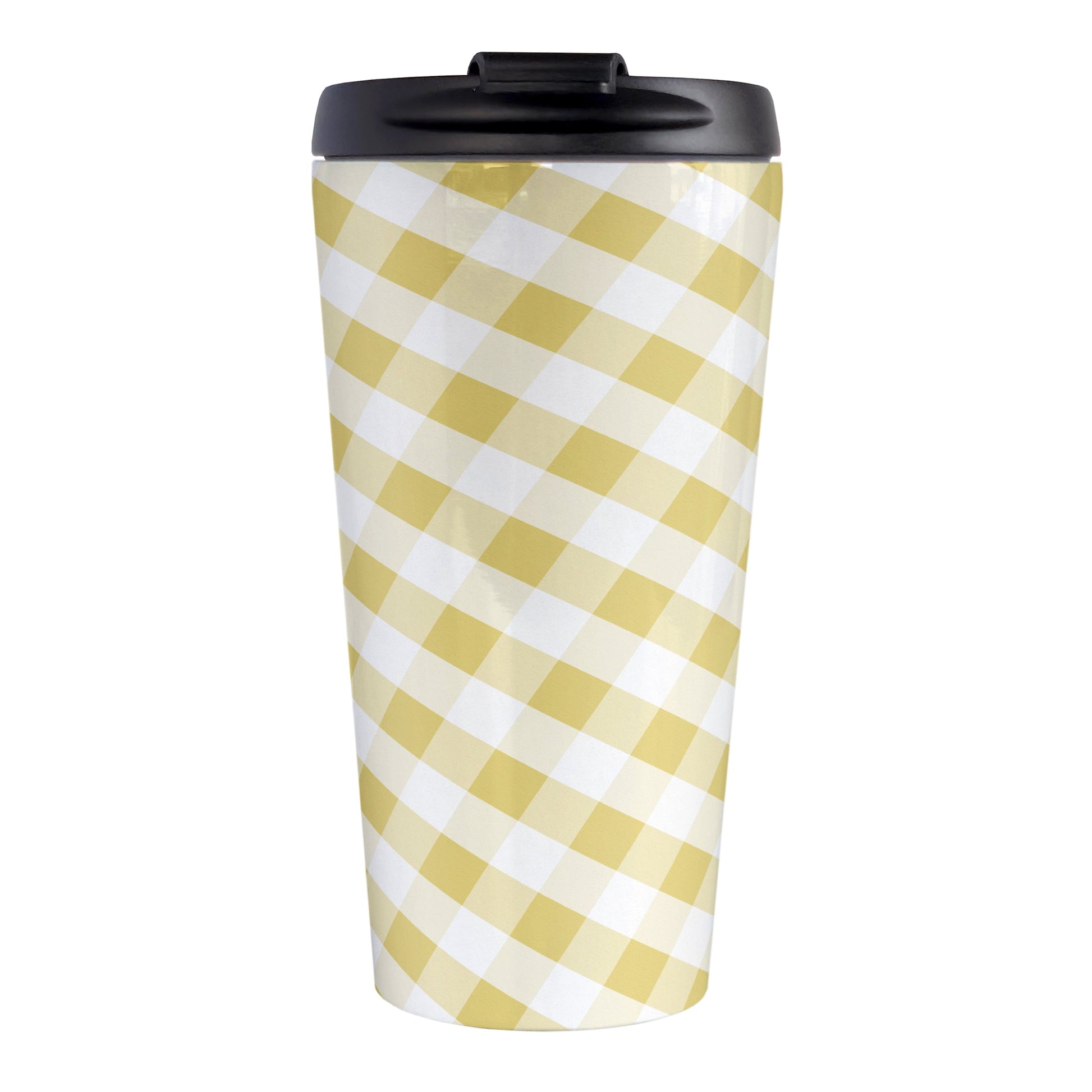 - Cheerful Design: Slanted yellow and white gingham pattern that wraps around the travel mug.